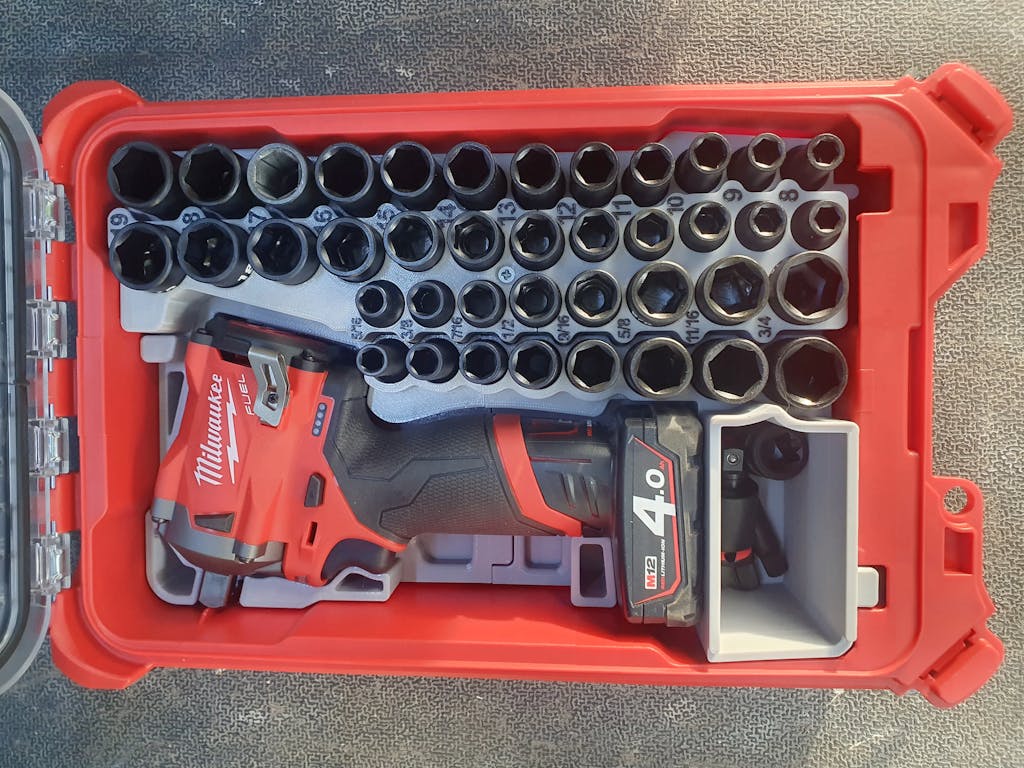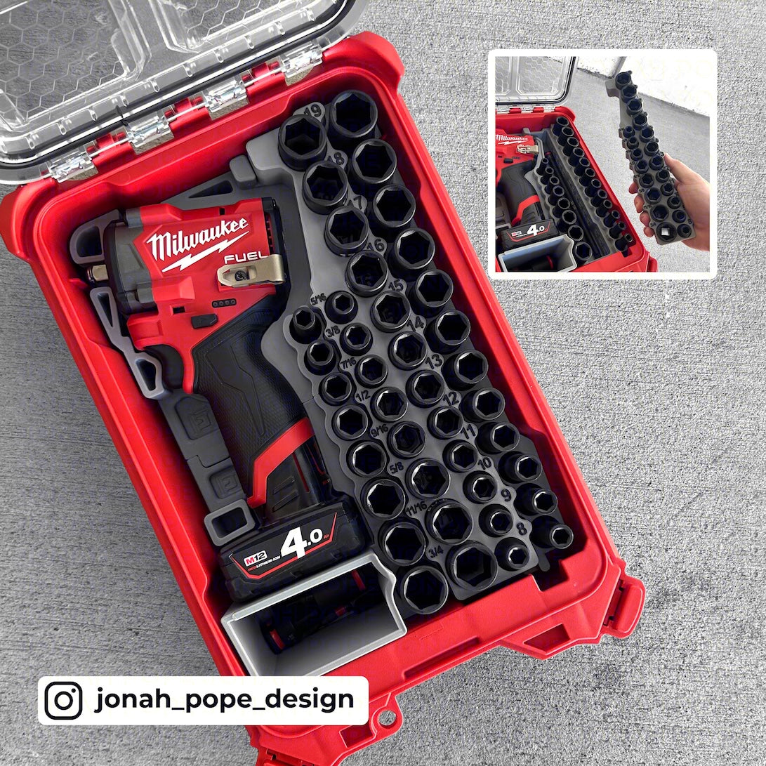 Custom insert designed to fit your Milwaukee PACKOUT to store your M12 Stubby Impact (3/8) plus the FULL 43 Piece Milwaukee Shockwave Impact Socket Set.